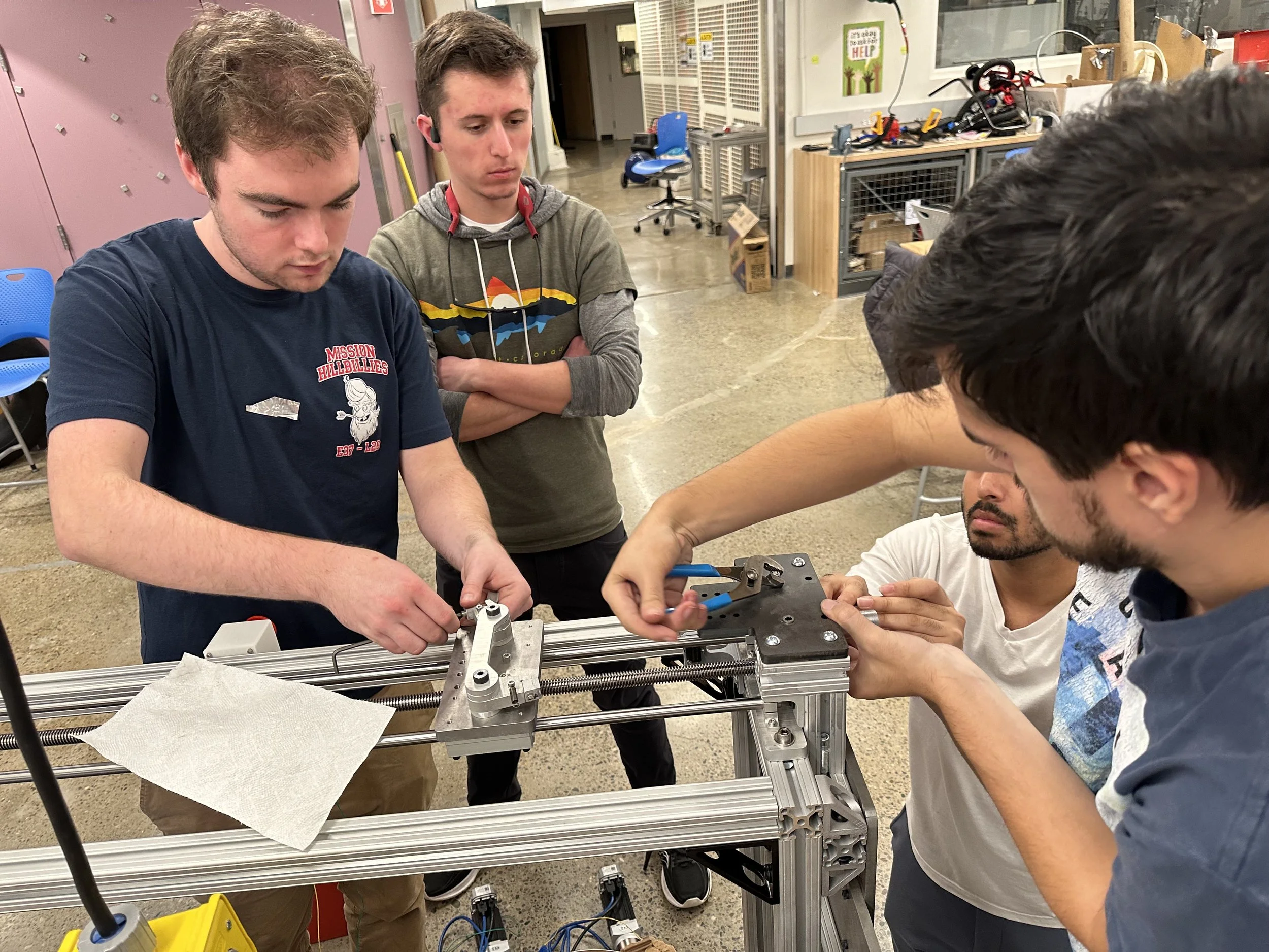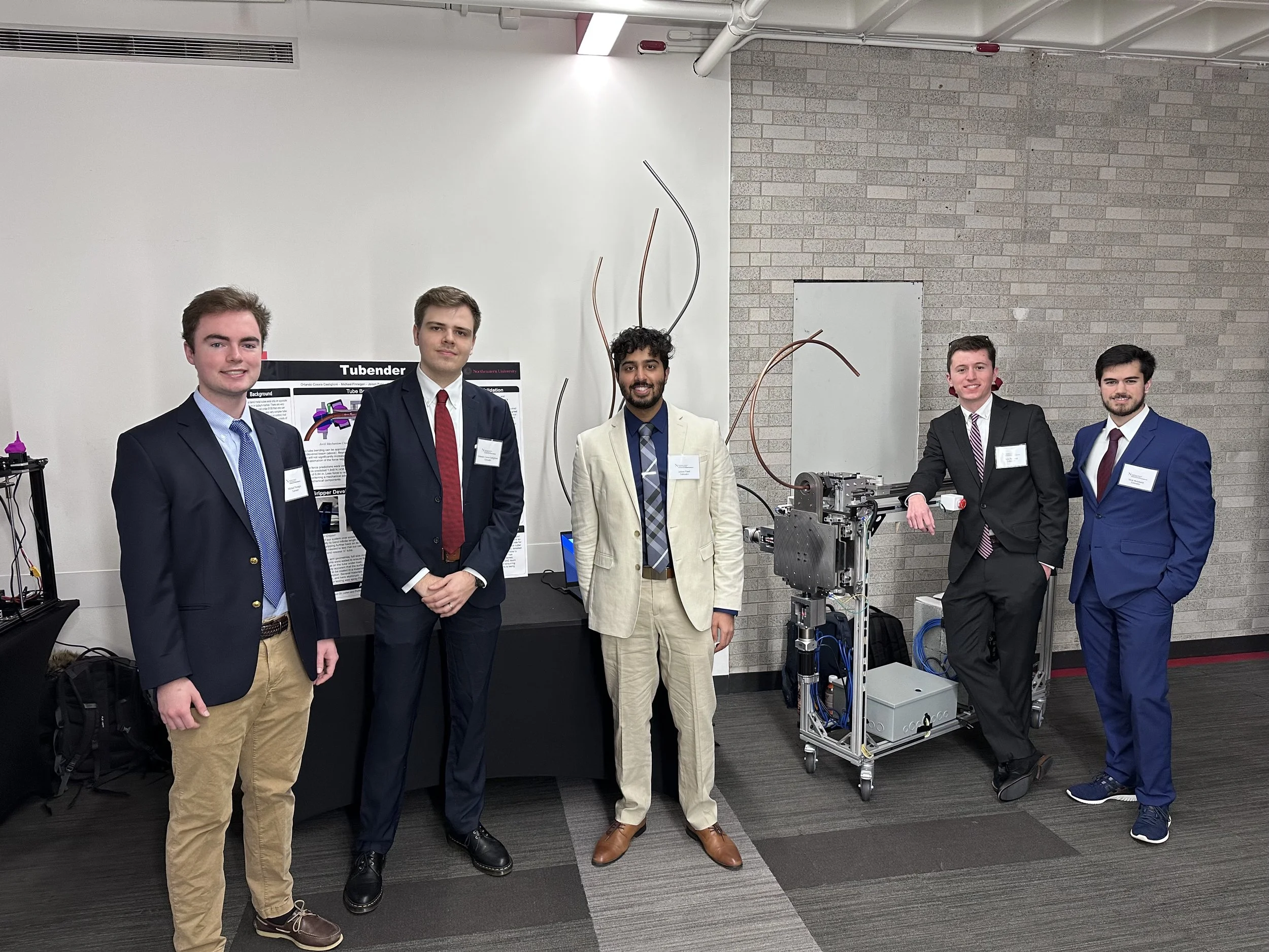 The team aimed to develop an affordable, small-scale, computer numerical control (CNC) tube bender that can create continuous bends. The machine would use an automatic feeder to drive an unprocessed tube towards an anvil, providing the necessary force to bend the tube. Controlled positioning of the anvil in a 2D plane would allow varying radii and direction of continuous bends, which lends itself to more complex geometry. Current CNC tube benders are very expensive and require frequent technician intervention, and most tube benders require fixed radius tooling and straight lengths of tube in between bends for the tooling to grab on to, limiting their designs. The team’s minimum functioning prototype would have a single pre-programmed bend in a tube, while the maximum functioning prototype would conduct a programmed set of tube bends converted from a CAD file.